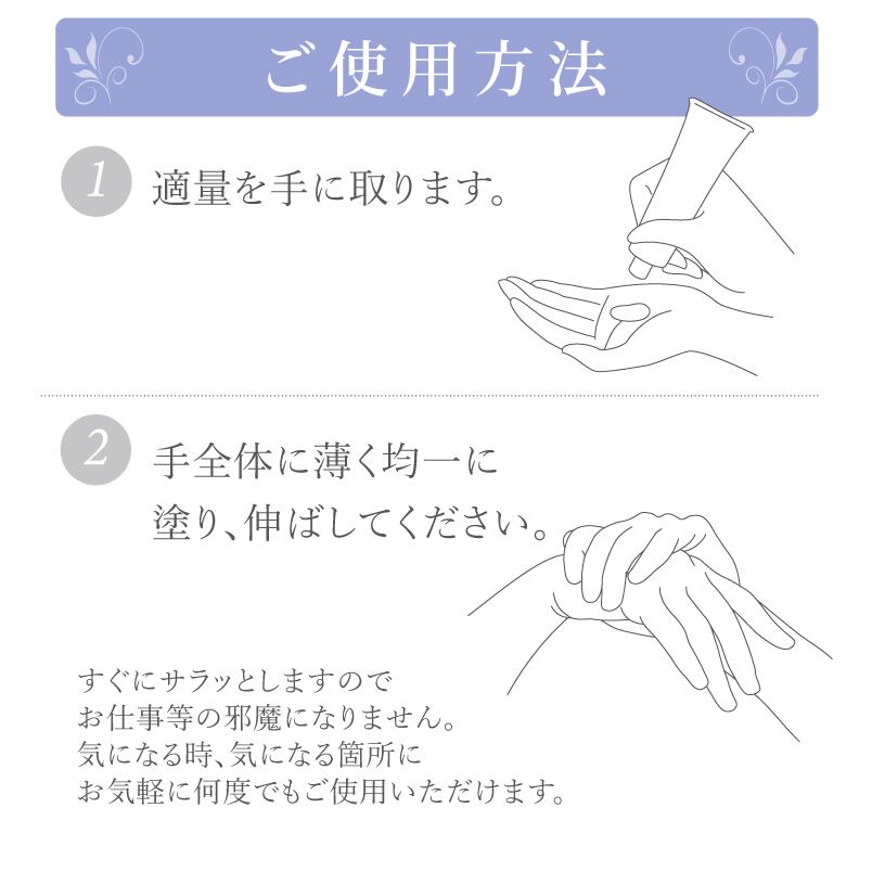 適量を手にとり、手の全体に薄く均一に塗りのばしてください。