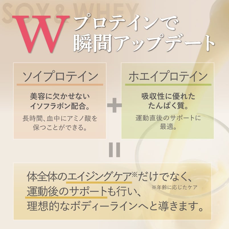 美容にうれしいイソフラボンが摂取できるソイプロテインに加え、吸収性に優れたホエイプロテインを配合しました。運動後のたんぱく質摂取にも最適で全身のトータルケアを目指します。さらに天然の甘味料エリスリトールを使用し、砂糖に比べ、甘さ控えめでダイエット中の飲みものとしても最適です。