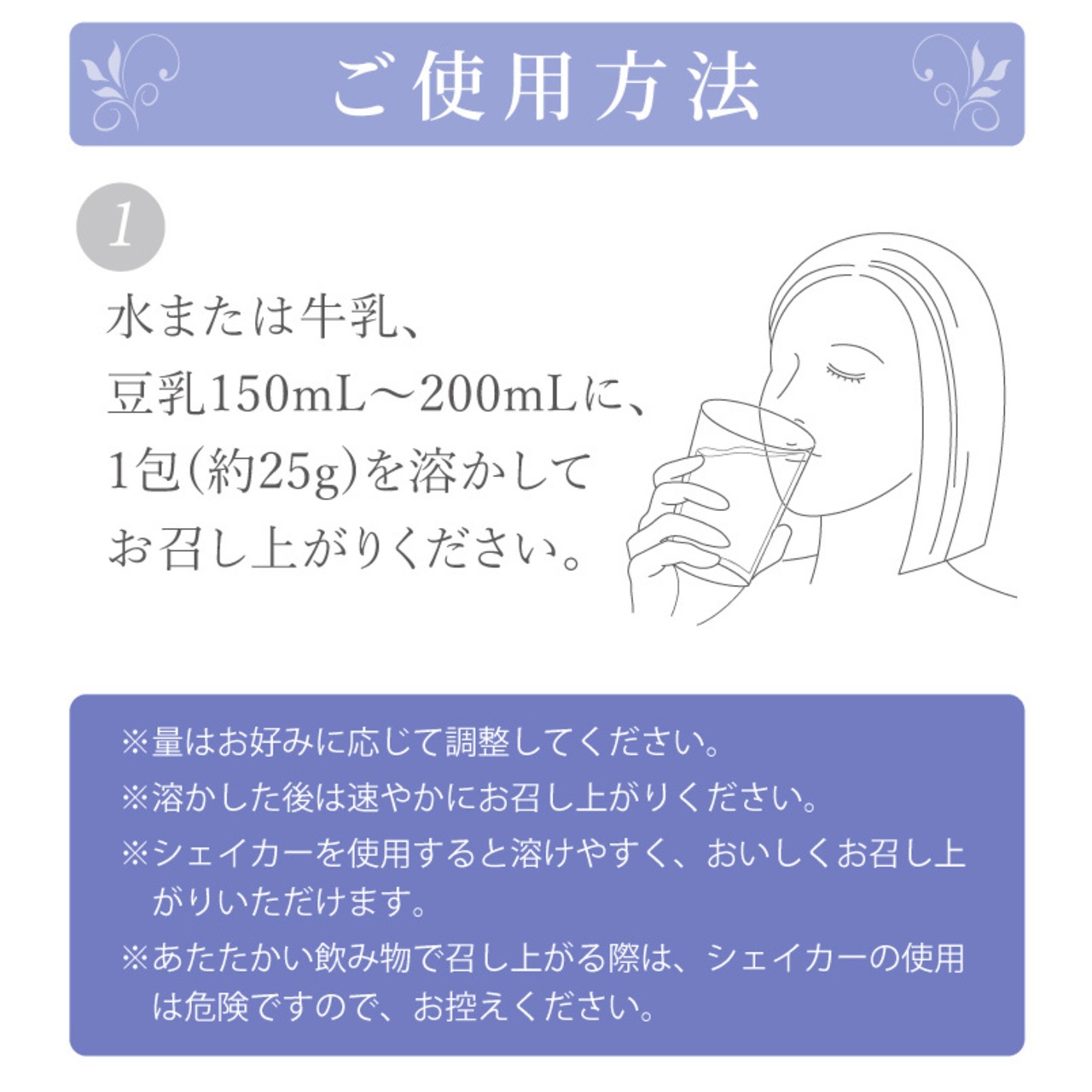 水または牛乳、豆乳150mL~200mLに、1包(約25g)を溶かしてお召し上がりください。