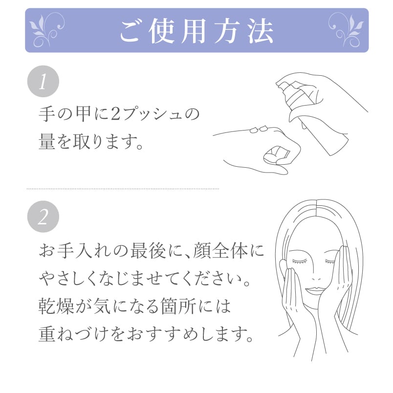 お手入れの最後に、2プッシュを手にとり、顔全体になじませてください。