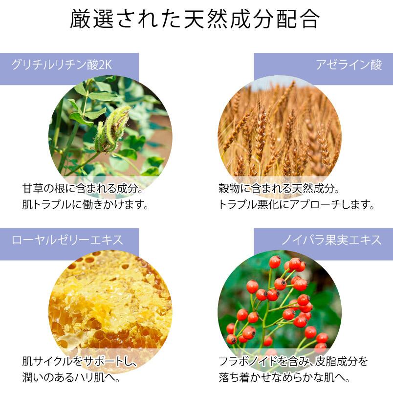 水(水)、ジ( カプリル酸/ カプリン酸)、 プロパンジオール ( ヤシ)、シクロヘキサン‐1、4‐ジカルボン酸ビス エトキシジグリコール ( サトウキビ)、テトラオレイン酸ソルベス―60 ( ヤシ)、PEG-11メチルエーテルジ メチコン ( ケイ石)、 ペンチレングリコール ( サトウキビ・ トウモロコシ)(アクリル酸ヒドロキシエチル/アクリロイルジメチルタウリンNa)、 コポリマー ( アミノ酸)、 スクワラン (オリーブ)、グリチルリチン酸2K ( 甘草)、アゼライン酸 (植物性)、ノイバラ果実エキス (エイジツ)(ノイバラ)、ヒメコウジ葉エキス (ヒメコウジ)、ハトムギ種子エキス (ハトムギ)、ピリドキシンHCl (ビタミンB6)、ローヤルゼリーエキス (ローヤルゼリー)、ムラサキ根エキス (シコン)、加水分解 ダイズタンパク ( 大豆)、加水分解アルギン (海藻)、硫酸亜鉛 ( 鉱石)、カプリリル2- グリセリル アスコルビン酸 ( ヤシ)、10‐ヒドロキシデカン酸 (ヒマシ油)、セバシン酸 (ヒマシ油)、1,10‐デカンジオール (ヒマシ油)、BG ( サトウキビ・ トウモロコシ)、 チョウジ油 ( チョウジ)、ティーツリー葉油 (ティーツリー)、 ユーカリ葉油 ( ユーカリ)、ハッカ葉油 (ハッカ)、 レシチン ( 大豆)、アテロコラーゲン (魚)、コンドロイチン硫酸Na (魚)、 カプリリルグリコール ( ヤシ)、ポリソルベート60 ( ヤシ)、アルギニン (植物性 アミノ酸)