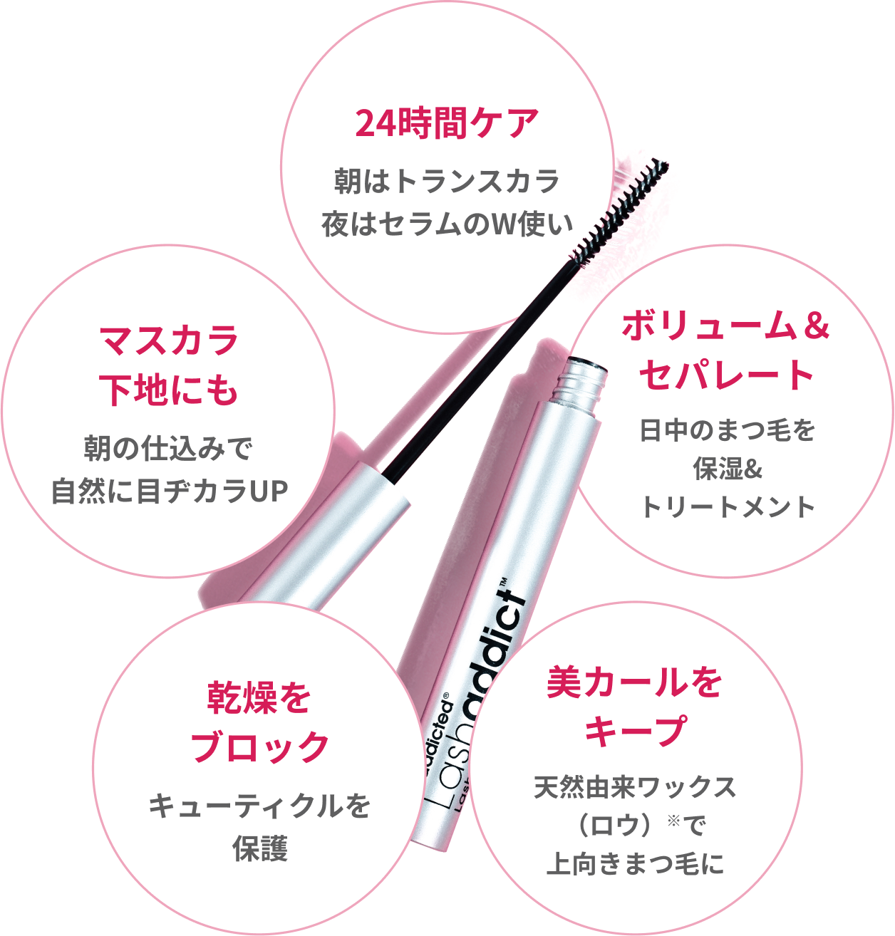 ケラチン生成をサポートする成分※1や天然由来ワックス※2などの働きで、日中のまつ毛を守りながら、美しいカールを叶えます。
