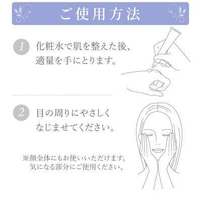 適量を気になる目元に、やさしくなじませてください。顔全体にもご使用いただけます。