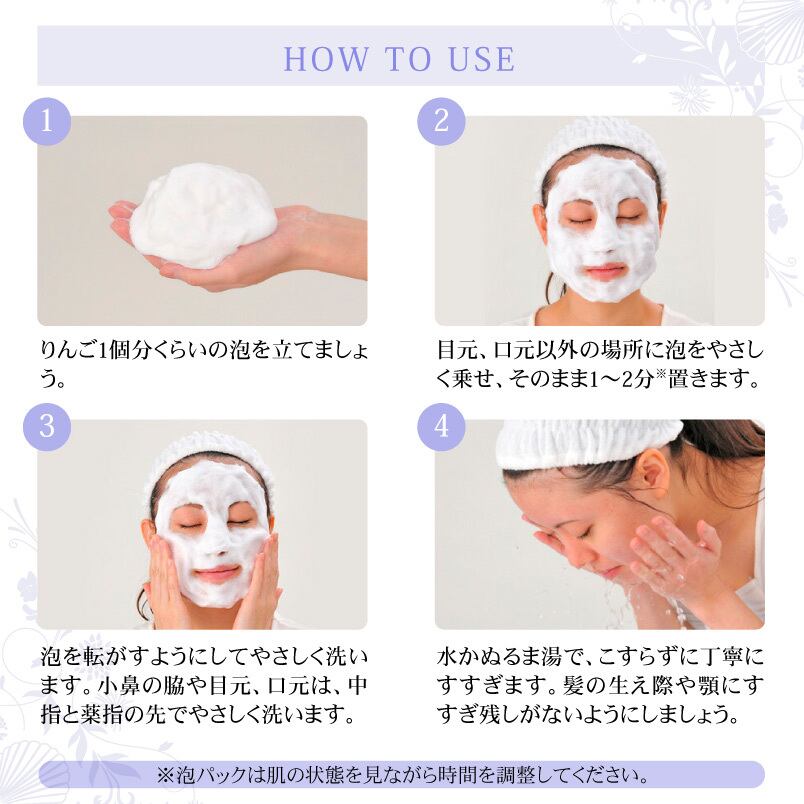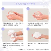 1.泡立てネットを使いピールソープをしっかり泡立て、顔から首の周りにかけて泡を転がすようにやさしく洗います。