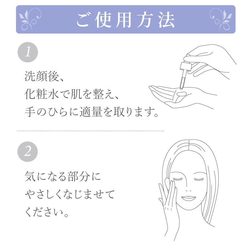 適量(1~2滴)を手のひらにとり、気になる部分へ指先で丁寧につけます。