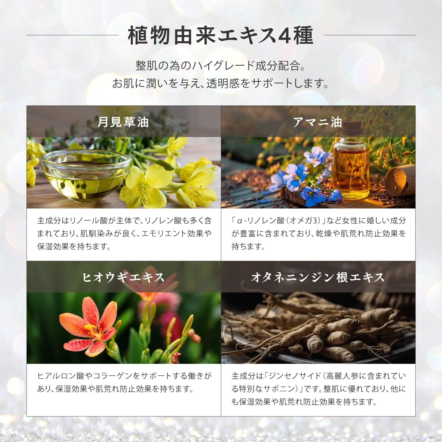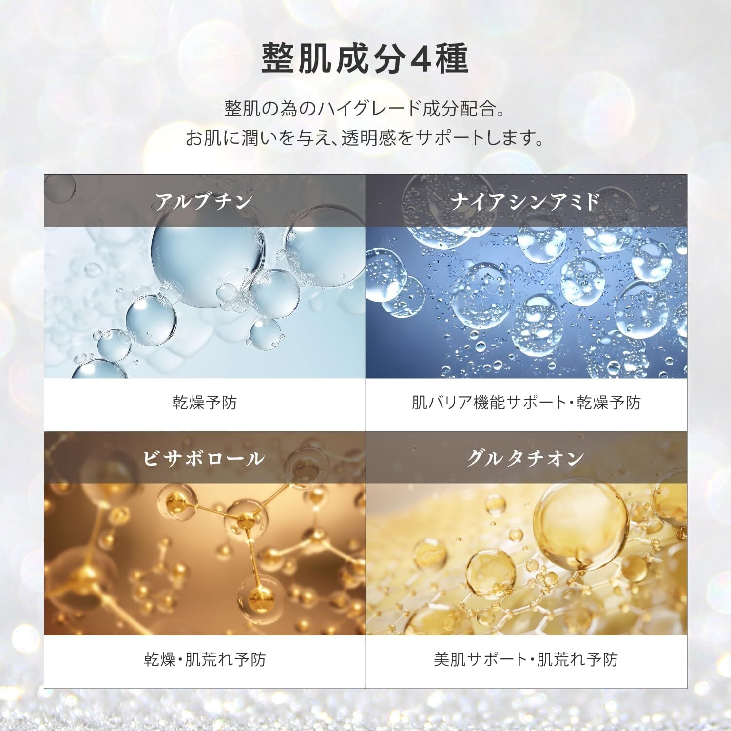 整肌のためのハイグレード成分配合。お肌に潤いを与え、透明感をサポートします。
