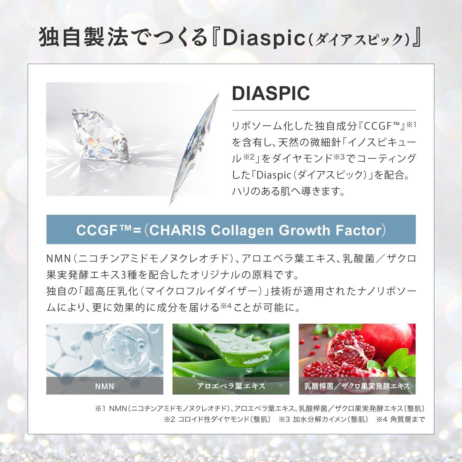 新たな原料「CCGF™」*¹を配合したダイヤモンドコーティング*²のイノスピキュール*³を配合。みずみずしい肌へ導きます。