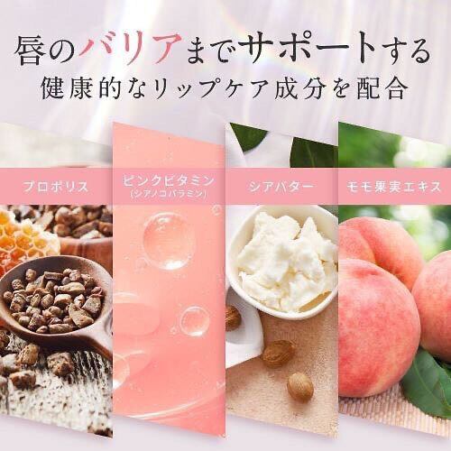 モモ果実エキス配合で、水分を補給してくらい唇のトーンを明るくし、コラーゲン分解を防ぎ、透明感のある唇に仕上げます。